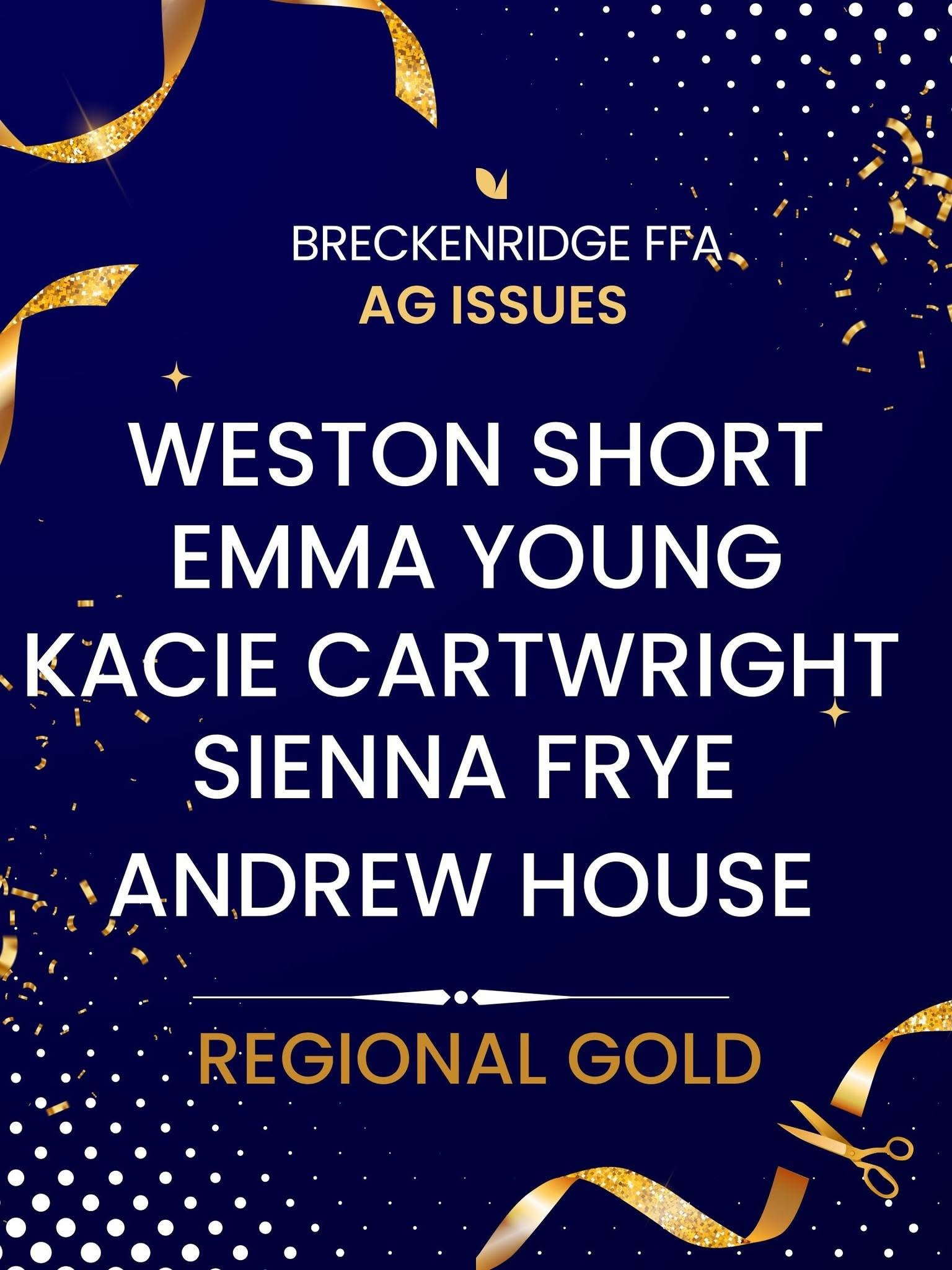 Going for Gold: Breckenridge FFA Regional Results! 🏆 Huge congratulations to our Breckenridge FFA members who competed at Regionals! You represented our chapter with excellence and brought home some incredible hardware. |