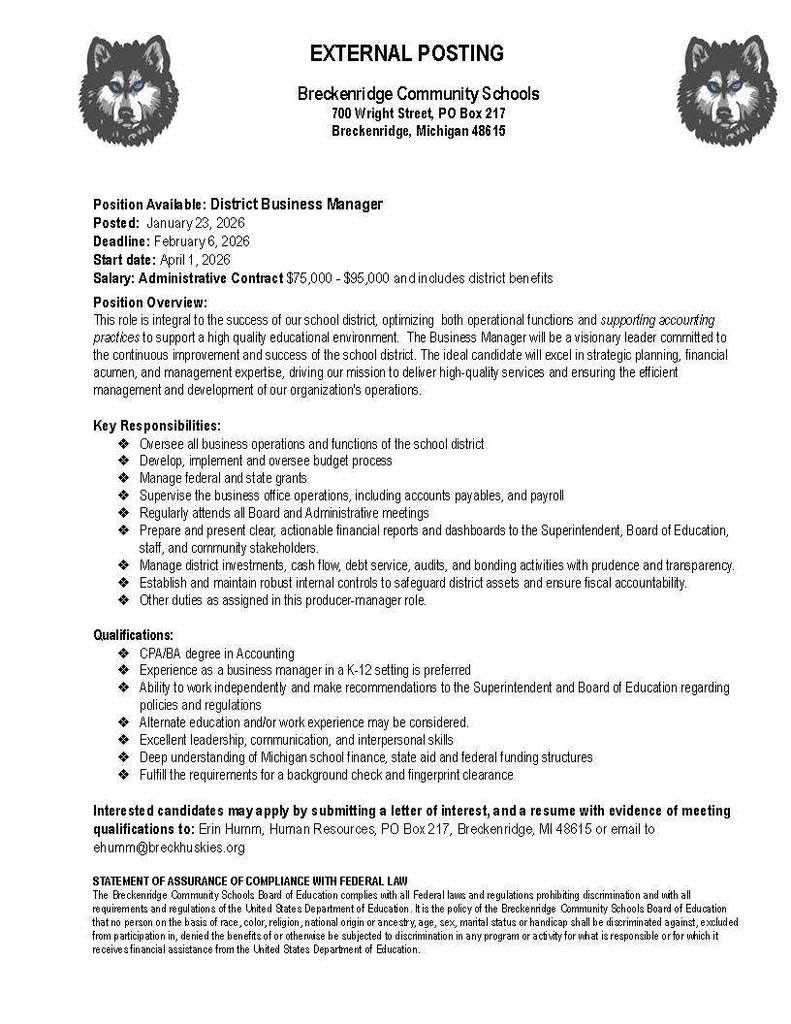 If you are a school district resident, and are interested in serving on the Breckenridge Board of Education, please submit a letter of interest and qualifications by 4:00 p.m. on February 6, 2026 to Amanda Staley, Board President, (email: astaley@breckhuskies.org mailing address: Breckenridge Community Schools, Attention: Board President, 700 Wright Street, Breckenridge, MI 48615).