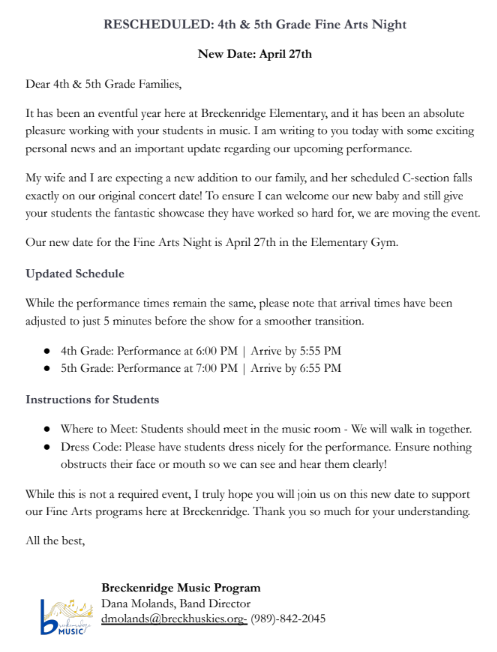 Each week, Mr. Slavik shares a quick recap of whatโs happening across Breckenridge Community Schools and a look ahead at upcoming events. Huskie Happenings is your go-to source for staying connected with school news, celebrations, and important reminders. Whether you're a student, parent, staff member, or community supporter, this newsletter keeps everyone in the loop as we grow and learn together. Stay informed. Stay engaged. Stay Huskie Strong! |