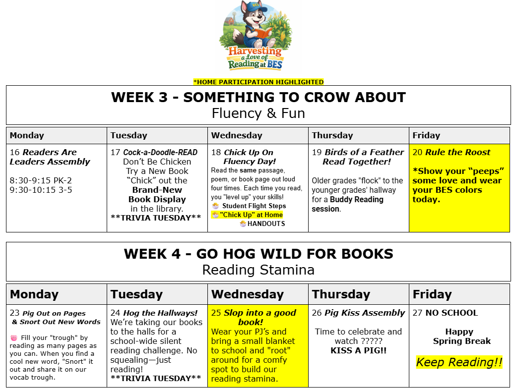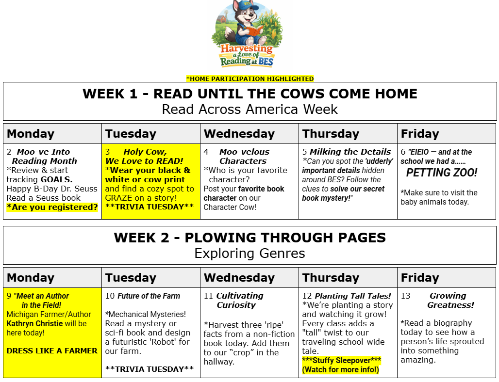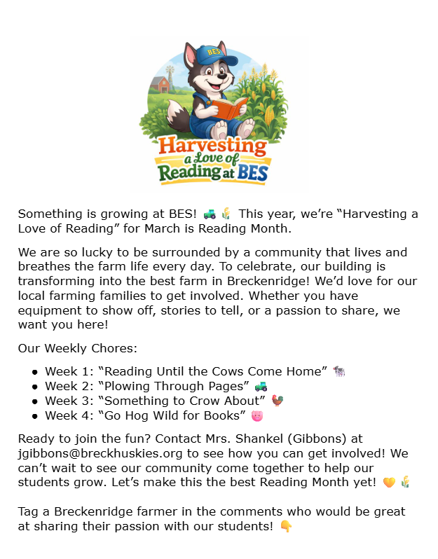 Something is GROWING at BES! ππΎ We are so excited to announce that this March is Reading Month, and our theme is "Harvesting a Love of Reading"! π Our building is transforming into the best farm in Breckenridge, and we have a jam-packed schedule of chores to help our students grow: π Week 1: Reading Until the Cows Come Home π Week 2: Plowing Through Pages π Week 3: Something to Crow About π· Week 4: Go Hog Wild for Books Check out the attached flyer for special themed days and assembly information! Letβs make this the best Reading Month yet! π | πΎMeet Our 2026 Reading Ambassadors! πΎ |