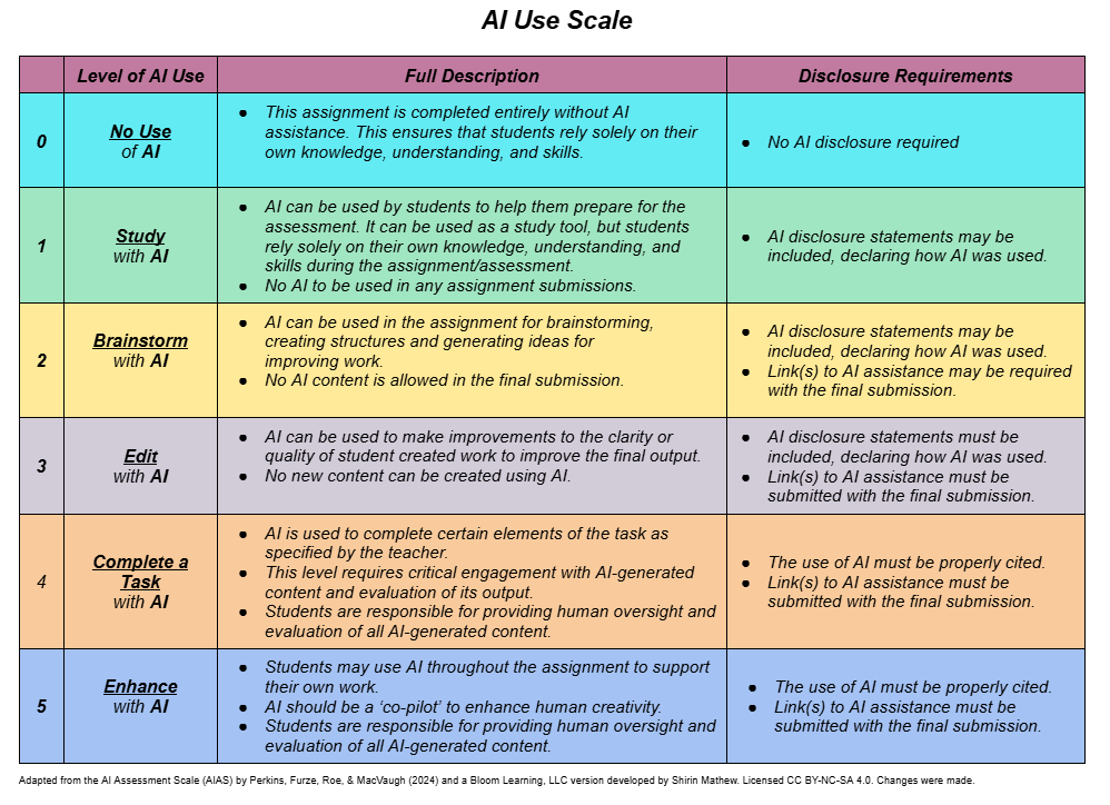 To ensure consistency across our classrooms, we are adopting a standardized AI Use Scale. This tool allows teachers to clearly define the "rules of engagement" for any given assignmentβranging from entirely human-generated work to collaborative "co-piloting" with AI. By using a common language, we are helping our Huskies move beyond simple "yes or no" AI rules and toward true responsible AI literacy.